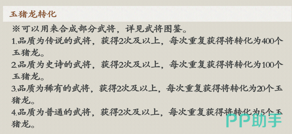 当同一武将重复获取达2次及以上时,系统自动将其转化为“玉猪龙”材料。玉猪龙为通用合成货币,可用于在武将图鉴界面定向兑换任意已解锁武将。具体可兑换名单以图鉴中标注的“可合成”标识为准,涵盖全部67名武将中的大部分角色。