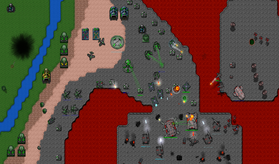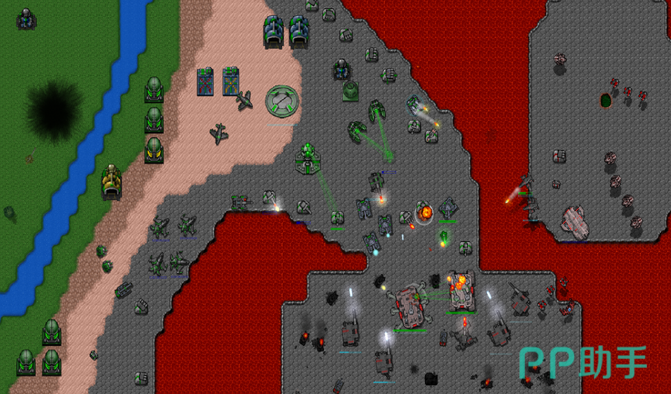 轻量级即时战略游戏,安装包仅约24MB,低配置手机及PC设备均可流畅运行。完整保留经典RTS核心体验:采集资源、建造兵营与防御工事、生产坦克/直升机/核弹等单位,实现海陆空立体协同作战。战役模式推动科技树解锁,生存模式考验持续防御能力,地图编辑器支持自定义地形、资源点与初始设定,拓展性强。