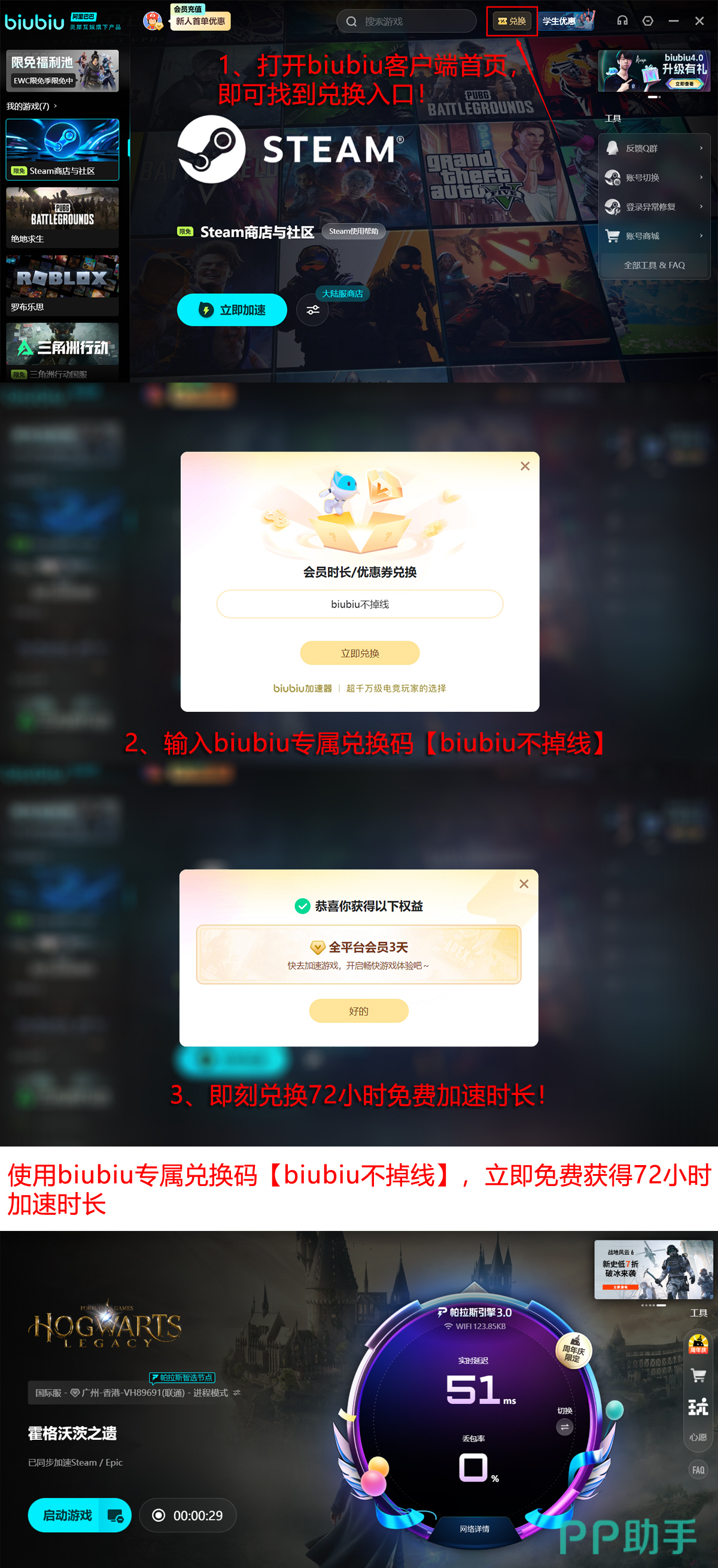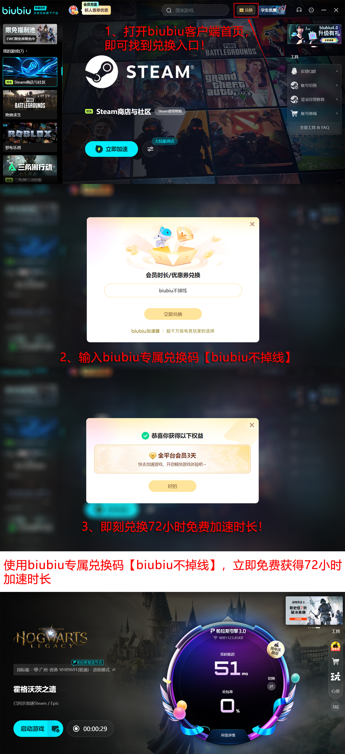 活动期间(即日起至1月18日),用户可在Biubiu平台“限免游戏池”中浏览并一键添加多款精选作品;同时,参与【biubiu不掉线】活动即可领取3天免费加速时长,新用户首次注册并完成登录,还将额外获赠24小时权益。两项叠加后,总计可享96小时全功能免费体验,充分验证其对《霍格沃茨之遗》下载效率的实际提升效果。