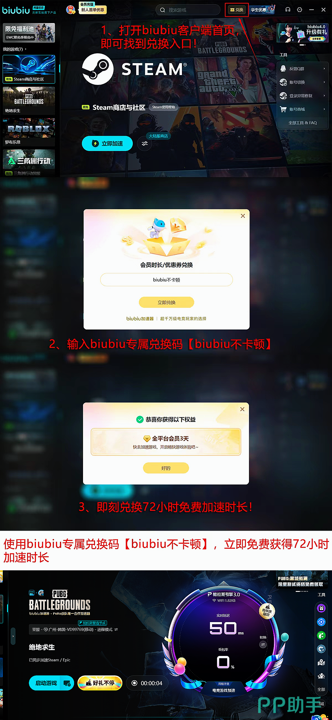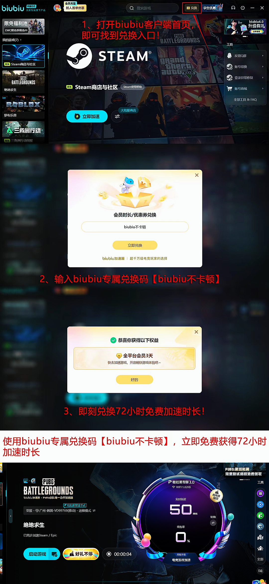 新用户注册biubiu加速器后,可立即享受24小时全游戏免费加速权益,覆盖PC端PUBG、移动端和平精英及其他主流联机产品。此外,平台推出通用福利机制:输入兑换码【biubiu 不卡顿】,即可额外领取3天加速服务使用权,新老用户均可参与。