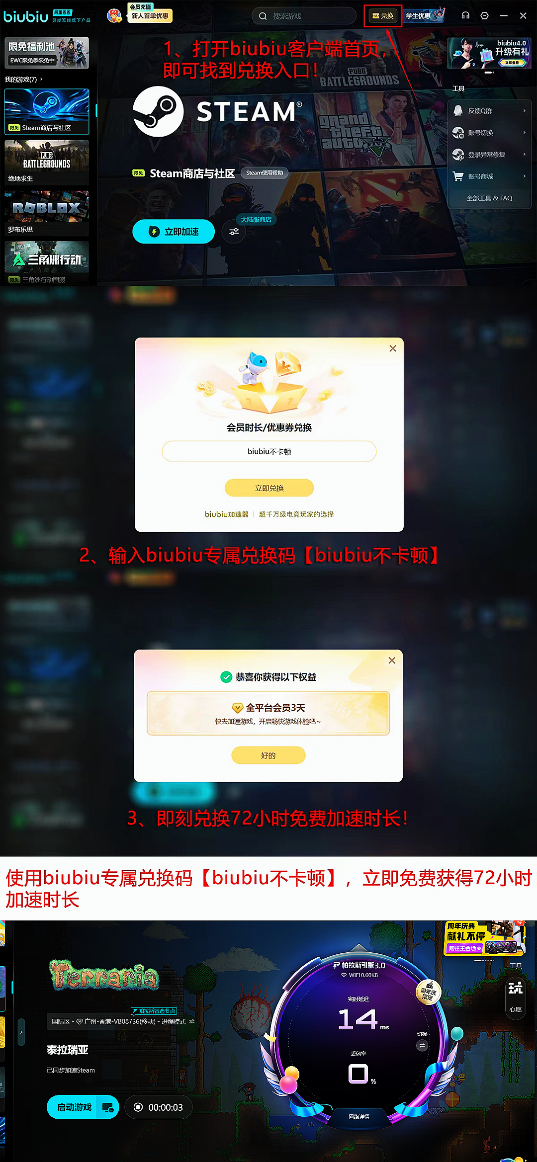 若使用体验良好,欢迎加入biubiu用户社群。当前新人注册biubiu都可以获得24小时免费加速,加速期间所有游戏均可支持,同时新老用户使用兑换码【biubiu不卡顿】可获3天免费的使用权哦!