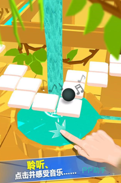 本作采用极简视觉风格,场景构建富有童趣与幻想感。核心机制围绕“音画同步”展开:黑球自动随背景音乐律动,玩家需在准确节拍点触控屏幕,触发方向切换,避免碰撞障碍物。全关卡音乐与场景严格一一对应,无随机匹配;节奏提示清晰,新手可快速建立操作直觉,持续提升专注力与手眼协调能力。