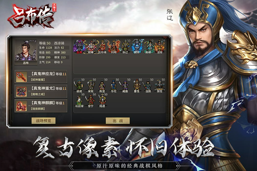 以吕布视角展开的沉浸式战棋叙事作品。剧情围绕其从并州飞将到虓虎陨落的全过程,嵌入多分支抉择点,玩家行为将实质性影响结局走向——可选择匡扶汉室、割据自立或另辟新途。关卡设计注重历史情境还原与策略纵深,每场战斗均设置动态天气系统(如暴雨降低弓兵命中、大风增强火系蔓延),兵种克制关系明确且具反馈感。人物建模采用动态立绘技术,随剧情推进自动切换表情、姿态与服饰细节,强化角色性格表现力与代入感。