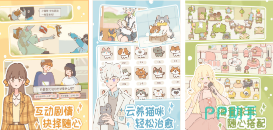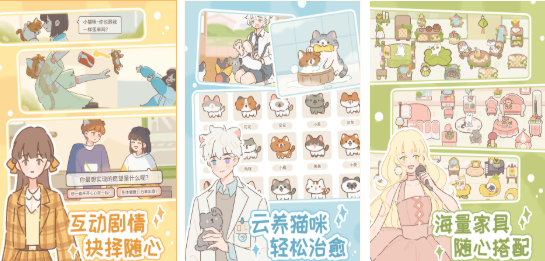 采用柔和水彩美术风格与分镜式漫画叙事结构,玩家收养一只流浪猫并为其命名。日常互动包括喂食、清洁猫砂、陪伴玩耍;进阶内容涵盖8位猫耳少年专属支线剧情。支持全场景自由装饰(猫窝、庭院等),并呈现四季更迭下猫草生长状态变化。宠物行为反馈细腻自然,节奏舒缓无压力,全程离线可玩。