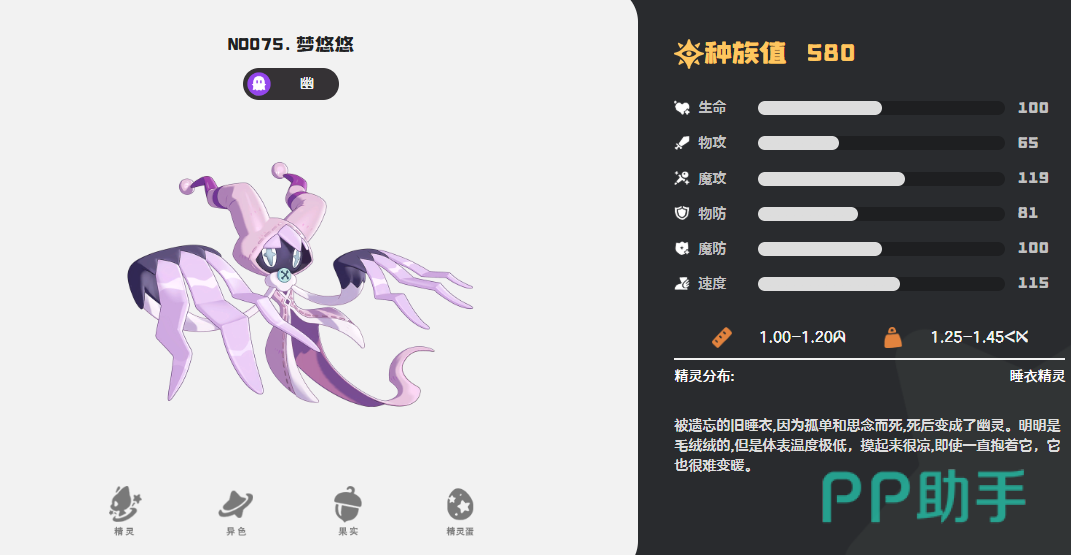 接着还要搭配一个梦悠悠穿旧睡衣的样子,这同样是一个幽灵属性的精灵!一旦对方入场的话,即可减少3能量。技能配置的话,更推荐使用勾魂,就可以偷取对方的能量。接着还需搭配防御,获得高额减伤能力,方便应对攻击。接着还可学幽灵爆发,用了后就能直接造成高额魔法伤害!最后再学一招摇篮曲,就可以让对方集体能耗变高,另外防御时,还有概率让对方眩晕!