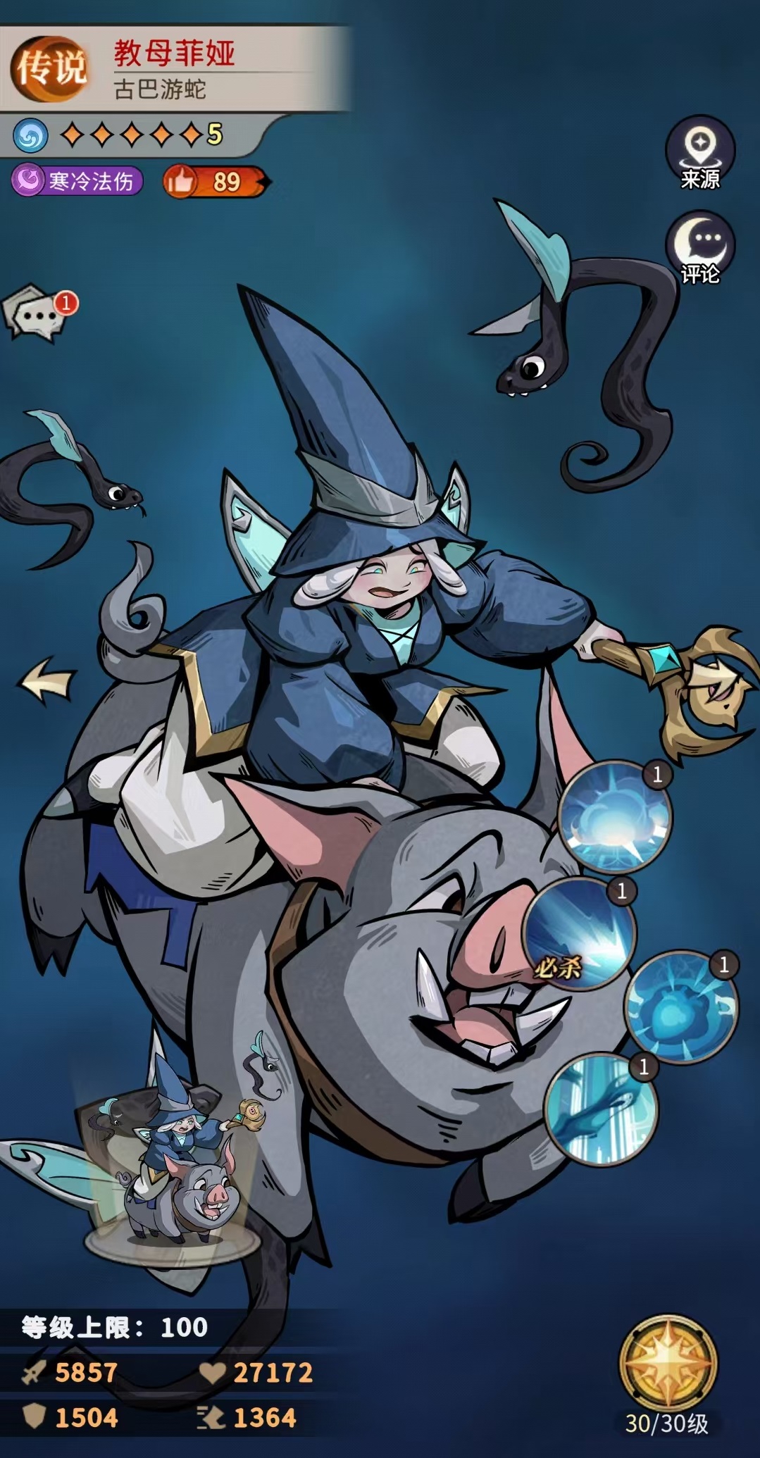 教母菲娅的定位是法师职业,它可以造成寒冷法术伤害。一技能仙灵术,随机选择三个目标附加法伤,有几率施加寒冷和冰冻。该技能强化之后,伤害系数提升冰冻和寒冷的触发几率提升。对方被寒冷后防御降低,速度降低,最多叠加5层,被冰冻后持续一回合无法行动。所以此技能的伤害尚在其次,对敌方造成的影响和控制才是最主要的。