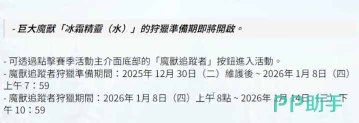 五、冰霜精灵狩猎计划启动:巨大魔兽【冰霜精灵】进入备战阶段,准备期为2025年12月30日至2026年1月8日;正式狩猎时间为2026年1月8日10:00至2026年1月14日22:59。入口位于赛季主界面底部“魔兽追踪者”按钮,建议提前组建队伍并配置对应属性装备。