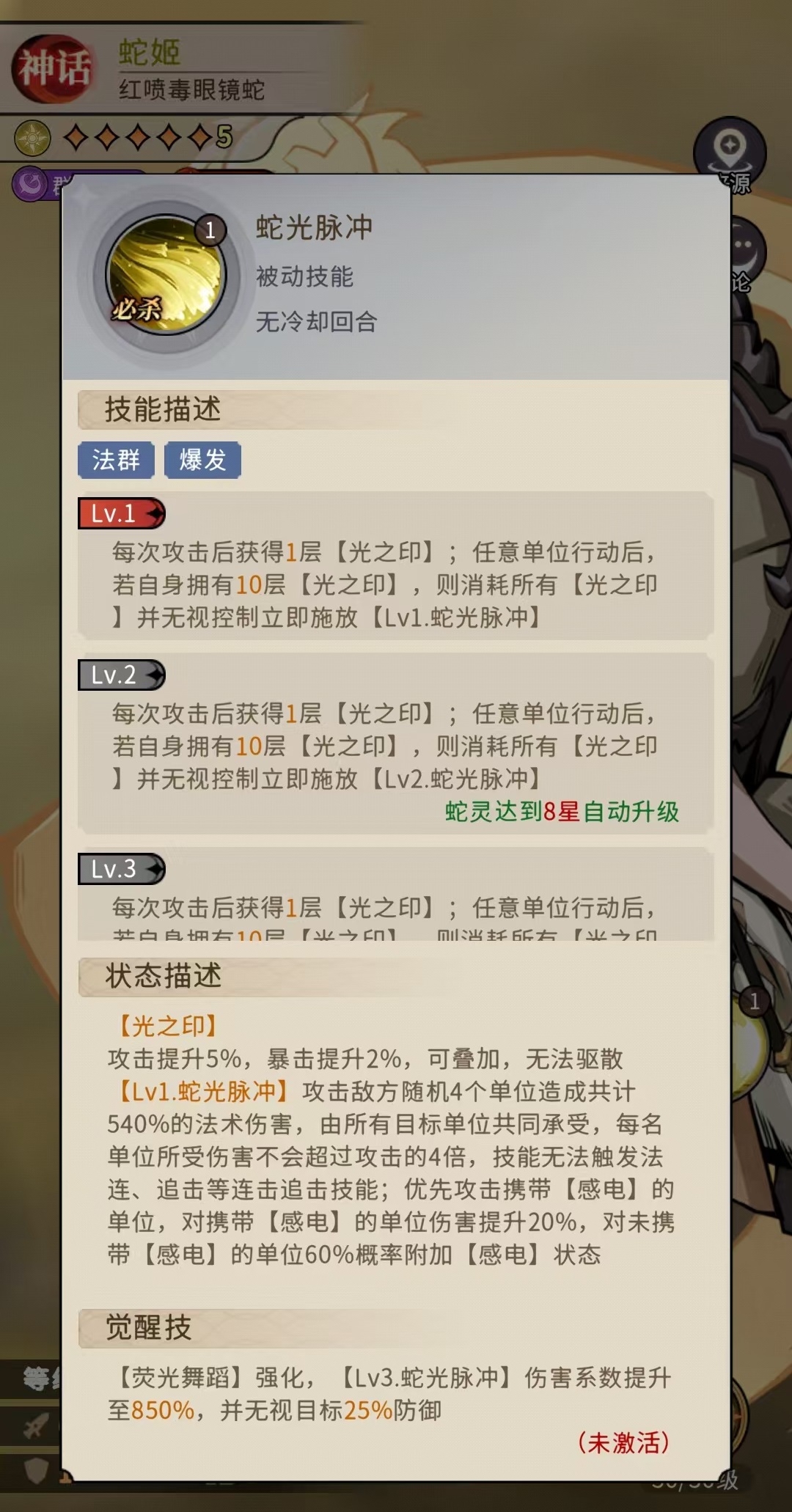 大家清楚了这些途径之后,就可以每天进行尝试,虽然几率低,但是总可以积攒起足够的本体用于提升。蛇姬这个角色本身非常出色,有极强的群伤爆发能力。主动技能除了命中多个敌人之外,还有几率附加感电,感电可以使对方在攻击时额外损失生命值。另外自身在攻击之后还可以叠加光之印,只要叠够10层光之印,就可以释放蛇光脉冲造成海量法术伤害。被动技能还可以大幅度提升攻击和伤害,以及扩充光之印的获取渠道,很快就可以将印记叠满,这样场上可多次释放脉冲,群体输出极为恐怖。