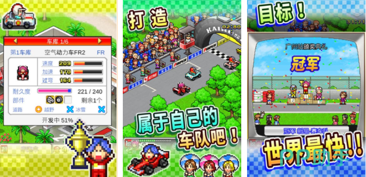 采用复古像素美术风格,构建轻松明快的竞速世界。新手友好度高,操作逻辑简洁直观。除单人竞速外,更强调车队经营玩法——玩家可招募车手、调配零件、升级载具性能,通过策略性装配打造专属战车,在多样化赛事中积累声望与资源。