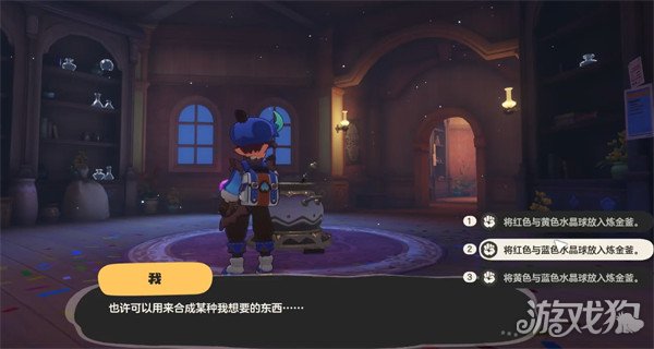 该秘境具体玩法就是提交对应的水晶球来解锁机关。第一个房间需要黄色水晶球,各位可在后方的架子上找到它,就能开启机关前往第二个房间。第二个房间需要提交紫色和绿色的水晶球,玩家可先将里面的水晶球拿完,然后在炼金壶用红色、蓝色水晶球合成紫色,黄色、蓝色水晶球合成绿色,就能顺利过关。