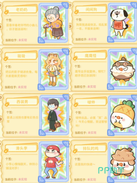 品质社区有觉得钱不是问题,将快乐定义为第一目标,依靠着收房租生活的土豪、经常会呆在一块的唐湖泊和明英伯、手持毛笔作画的阿幸、每天都乐呵呵的老爷爷、总是会看典籍的菜鸡老者、可爱的小瓜鸡以及小雀。