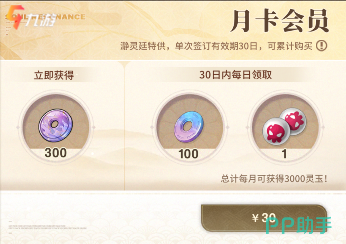 30元月卡:每日可领取100灵玉和60体力,能够持续领取一个月,光从体力来说每天就能领先普通玩家一大截,是必购项。