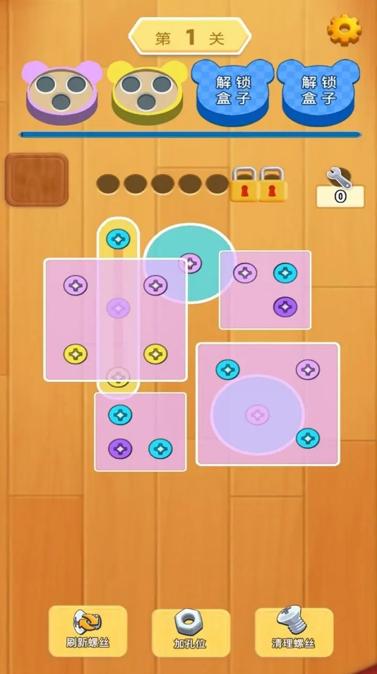 这是一款融合空间逻辑与机械操作感的解压向益智游戏。每关呈现若干被螺丝锁固的物件,玩家需使用虚拟螺丝刀逆时针旋转,逐个卸下固定件。难点在于孔位数量恒定且不可复用,必须依据物件叠压关系与结构依赖性,预判拆解顺序——先松动上层遮挡物,再释放底层目标,避免卡死。该设计在提供稳定操作节奏的同时,也锻炼了基础的空间推理能力,使解压过程兼具认知参与感。
