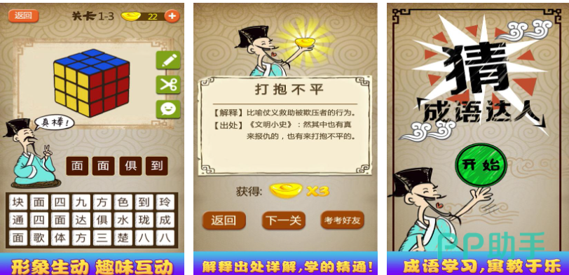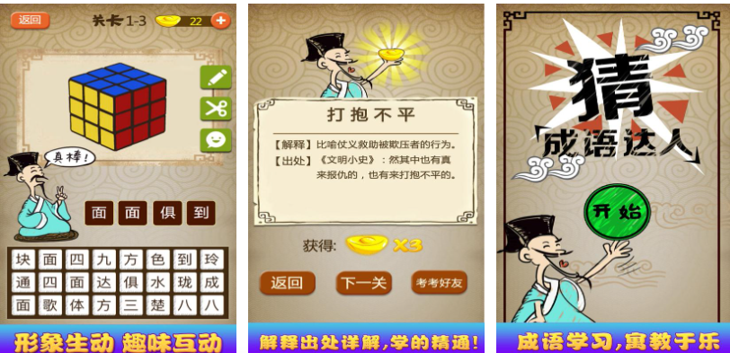 主打图像化成语演绎与填空式解谜。部分关卡以四格漫画、古风插画或生活场景图呈现成语意境,玩家需结合画面线索与残缺字格推断目标成语。全部成语附带标准释义、典故来源及现代用法示例,内容经语文教育领域专业人士审校。题库覆盖小学至高中课标高频成语,亦包含大量耳熟能详的经典表达,兼顾教学适配性与大众娱乐性。