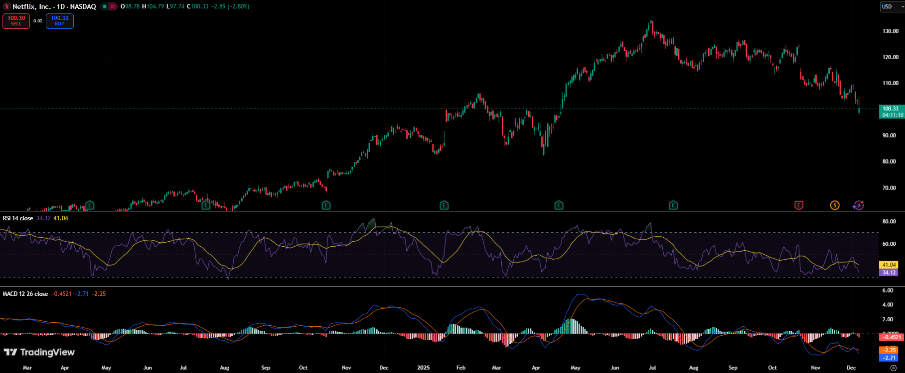 消息公布后,华纳兄弟探索频道(Warner Bros. Discovery)的股价上涨超过3%,而奈飞(Netflix)则反应更为谨慎。其股价最初下跌,盘中跌幅一度接近3%,交易价格接近100.33美元。市场情绪指标也反映了这种谨慎情绪:相对强弱指数(RSI)徘徊在41左右,表明动能减弱但尚未超卖,而MACD