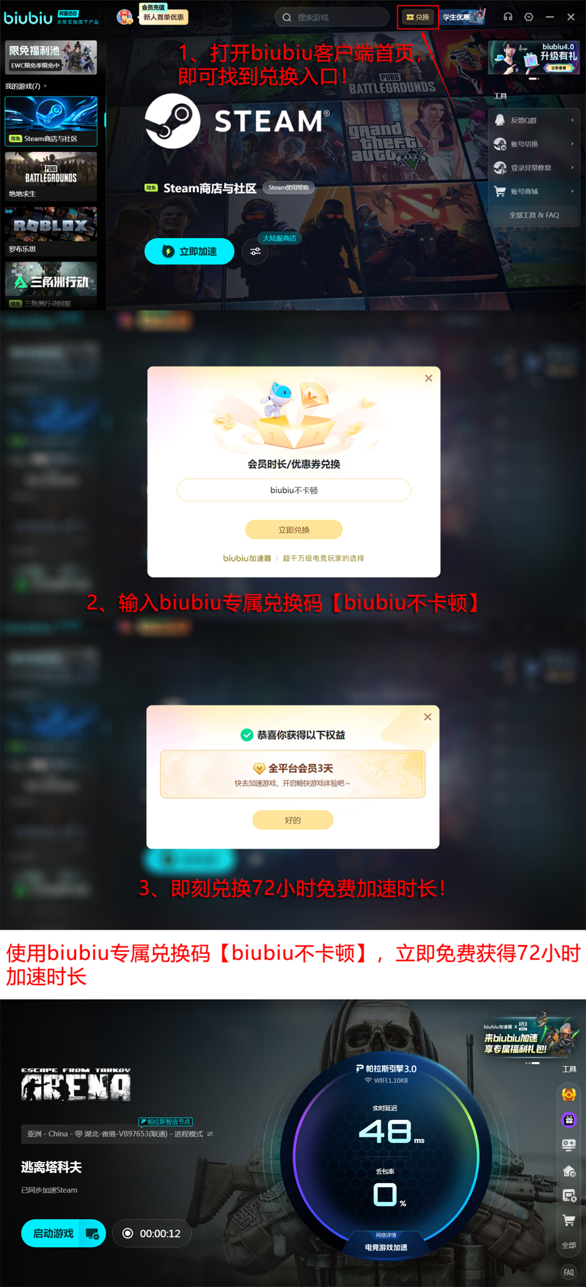 新用户注册后即可领取24小时免费加速时长,另可通过兑换码【biubiu不卡顿】额外激活72小时服务权限,合计享有96小时无限制加速体验。该周期足以覆盖完整新手引导流程、多张地图实战演练及PvE任务深度测试,直观验证加速前后帧率稳定性、加载速度及连接成功率差异。目前会员订阅方案按日均成本计算低于1元,支持灵活续费,兼顾长期使用经济性与服务持续性。