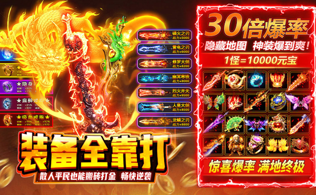 本作延续了传奇IP高爆率的核心优势,同时坚持“全靠打、不靠充”的运营逻辑。所有装备、强化材料、进阶道具均通过副本、BOSS战、野外刷怪等常规玩法获取,杜绝数值垄断。满屏光柱掉落+动态特效反馈极大增强打宝沉浸感;三职业平衡设定配合一键强化系统,让平民玩家也能快速构建成型战力。地图复刻经典沙巴克攻防节奏,PVP体验硬核且公平。
