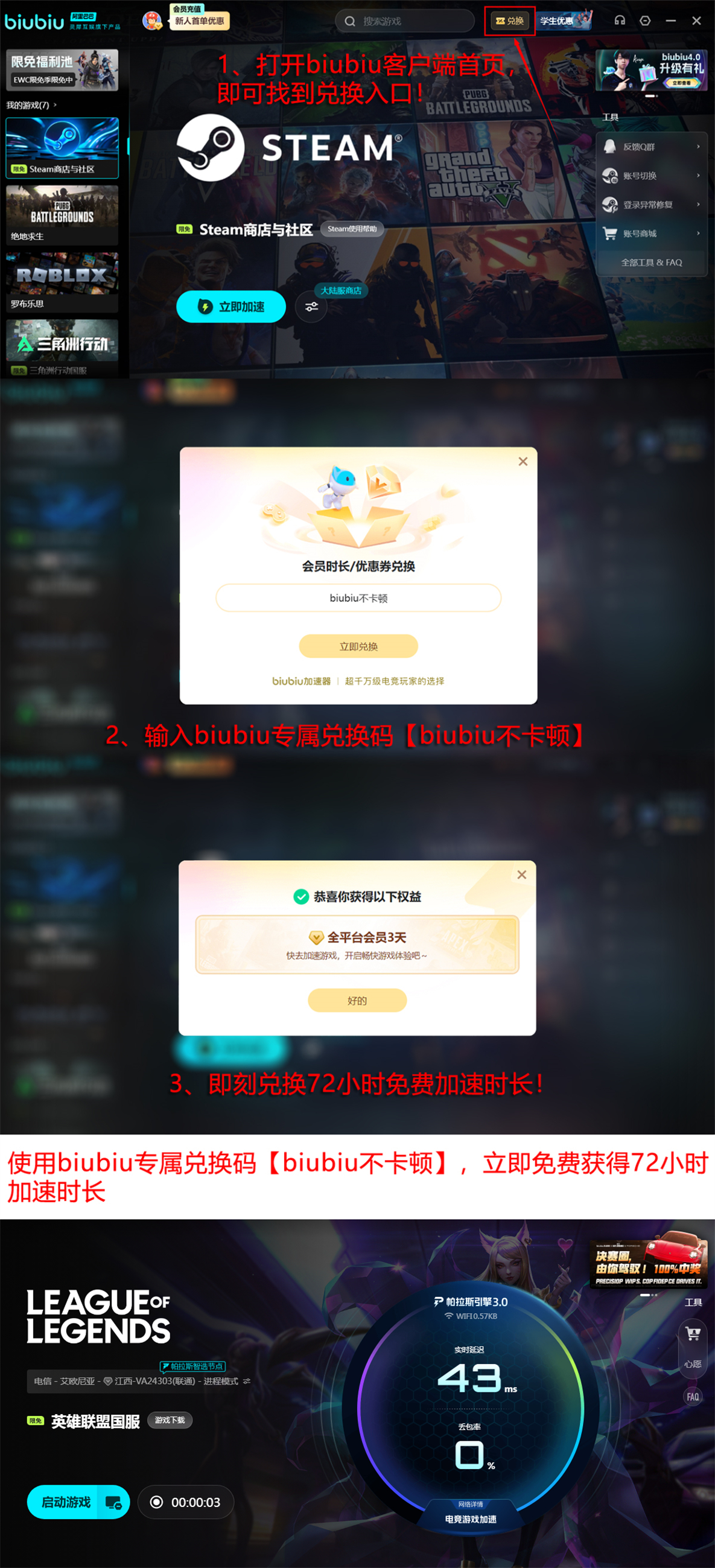 为降低体验门槛,biubiu加速器面向新用户推出双重激励政策:注册后自动获得24小时全功能免费加速权限;另提供通用兑换码【biubiu不卡顿】,单账号限用一次,可额外激活72小时加速服务。两项福利叠加,新用户可连续享受96小时无限制优化体验,充分验证加速效果与稳定性。