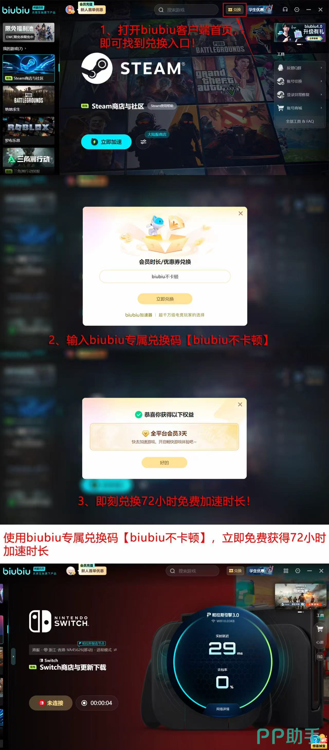为降低用户使用门槛,biubiu加速器同步推出多项新手扶持政策:新注册用户可即时领取24小时免费加速时长;所有用户均可通过首页输入【biubiu不卡顿】兑换码,一次性获得3天连续加速权益。两项福利叠加后,新用户最高可享96小时无间断服务体验,切实覆盖测试期与深度游玩阶段的全部需求。