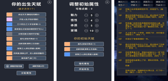采用纯文字交互界面,依托高密度文本叙事呈现修真世界的因果律与命运张力。开局提供九类出身设定,每位角色可择取至多三项初始天赋,如“灵脉异象”“商道奇才”“命格悖论”等,不同组合将触发专属事件链与结局分支。所有抉择均影响寿元、心魔值、宗门声望等隐藏参数,推动人生轨迹向长生、入魔、飞升或尘世圆满等方向演化。