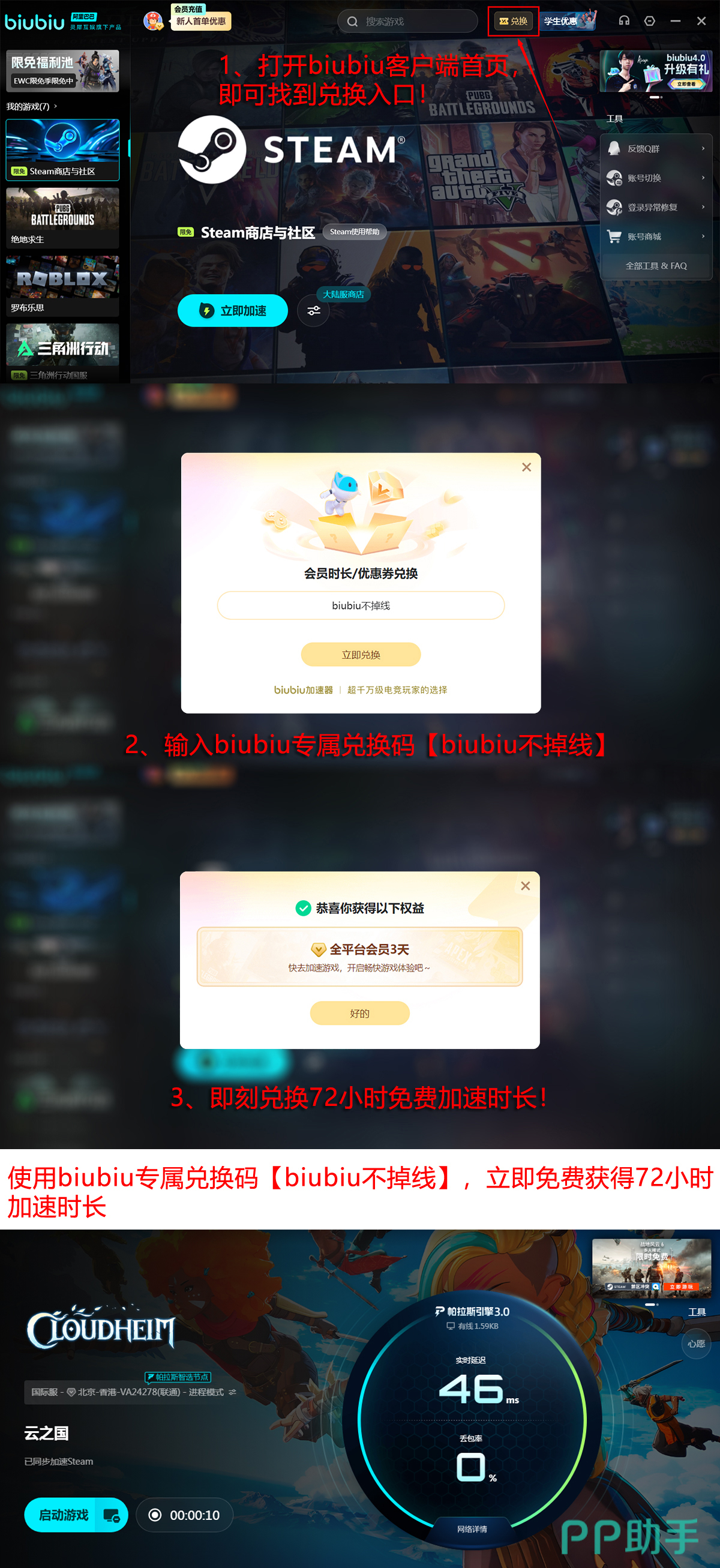 现在前往Biubiu平台,输入专属口令【biubiu不掉线】即可领取3天免费加速服务,首次注册登录还可额外获赠24小时会员时长,双重福利叠加最高可达96小时免费用体验。