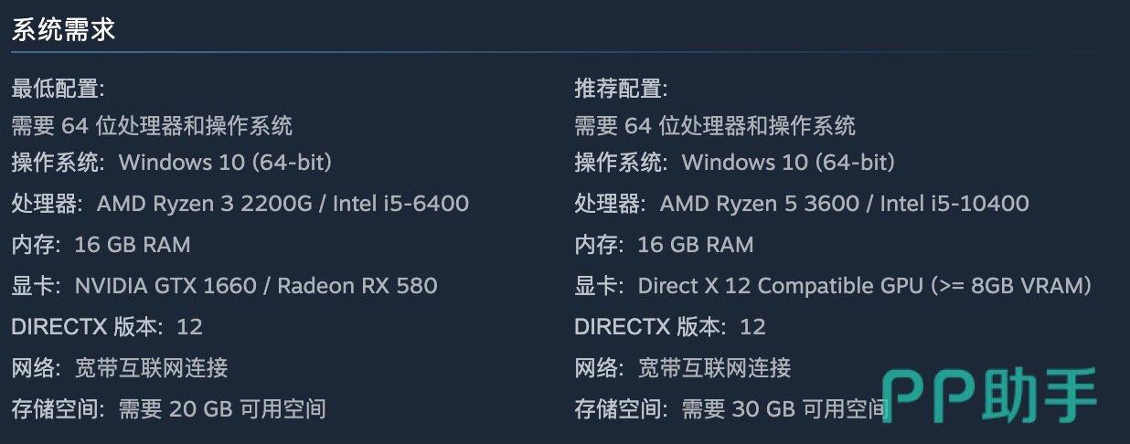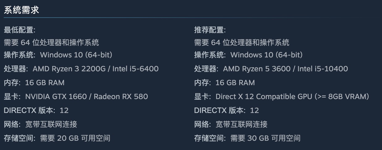 游戏设置了最低与推荐两种配置标准。最低配置可在720P分辨率、低画质下维持约30帧的稳定表现,需搭载i5-6400处理器、英伟达1660或RX 580及以上显卡,并预留至少20GB可用存储空间。更详细的参数信息请参考下图: