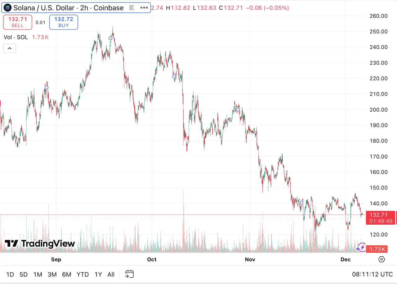 市值该股总市值达743.9亿美元,报132.84美元,过去24小时内下跌4.97%。由于交易量下降超过18%至40.4亿美元,整个市场走势谨慎。动能保持中性,价格仍在137-142区间附近徘徊,交易者普遍认为该区间是短期关键点。这与社区在Solana形态更新中分享的更广泛的技术分析观点一致,该更新内容可在帖子中查看。CoinMarketCap 的社区委员会。