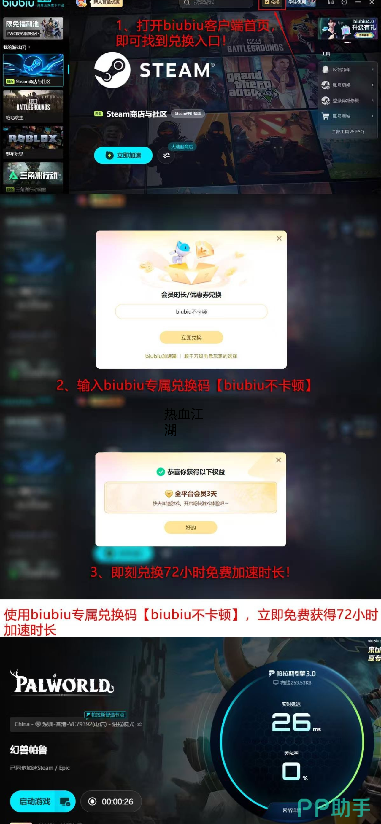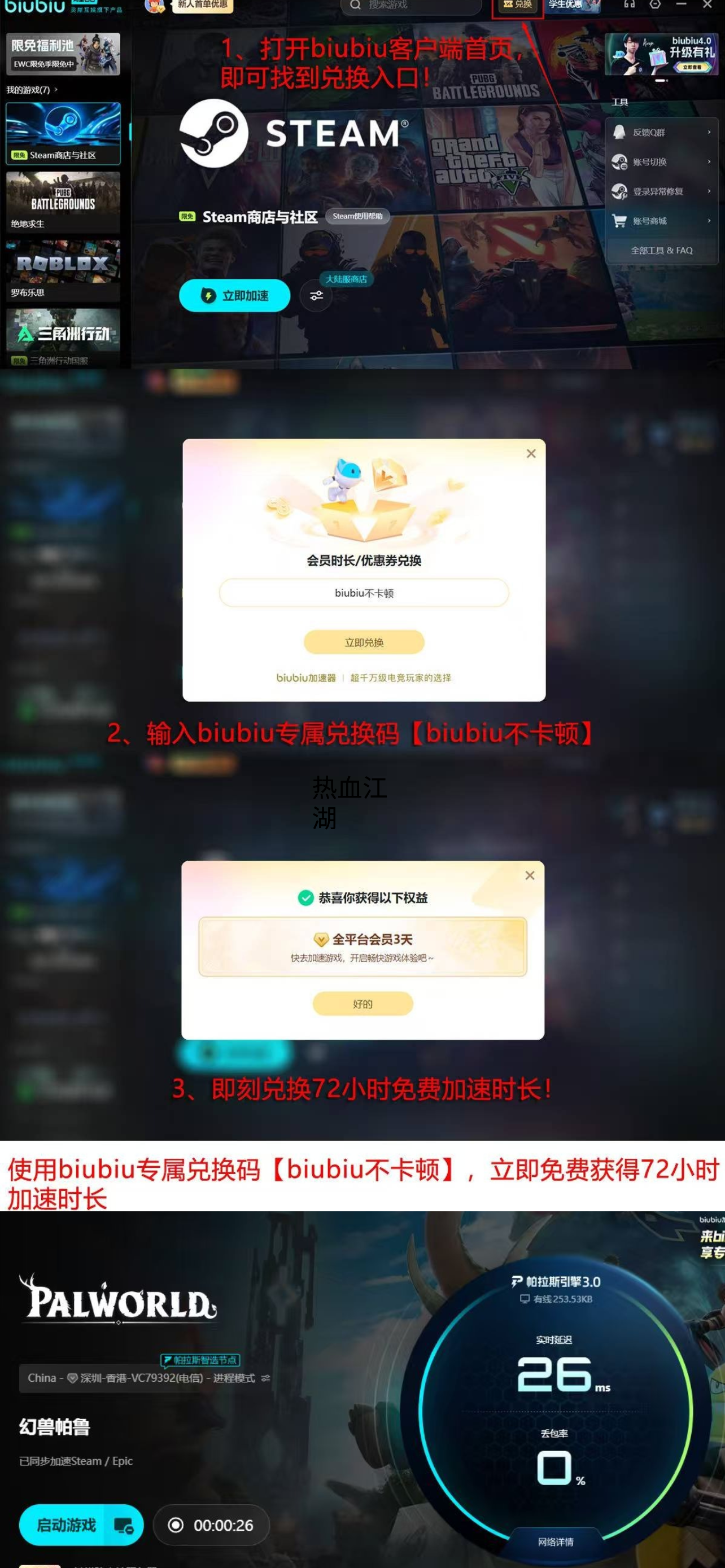 为了让广大用户切实感受到加速效果,平台推出了多项试用福利。所有用户均可通过兑换码【biubiu不卡顿】获得连续三天的免费体验资格。新注册用户更可在首次登录时额外领取24小时免费时长,总计可享96小时的加速服务。
