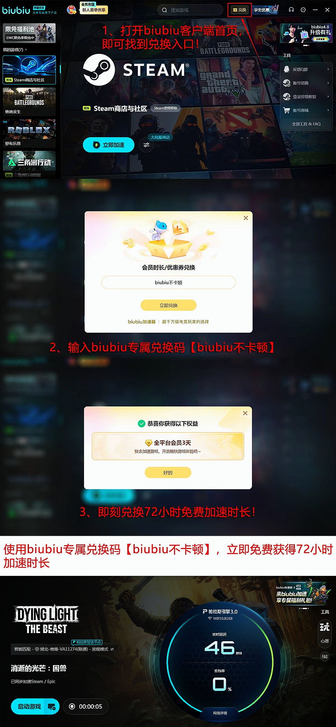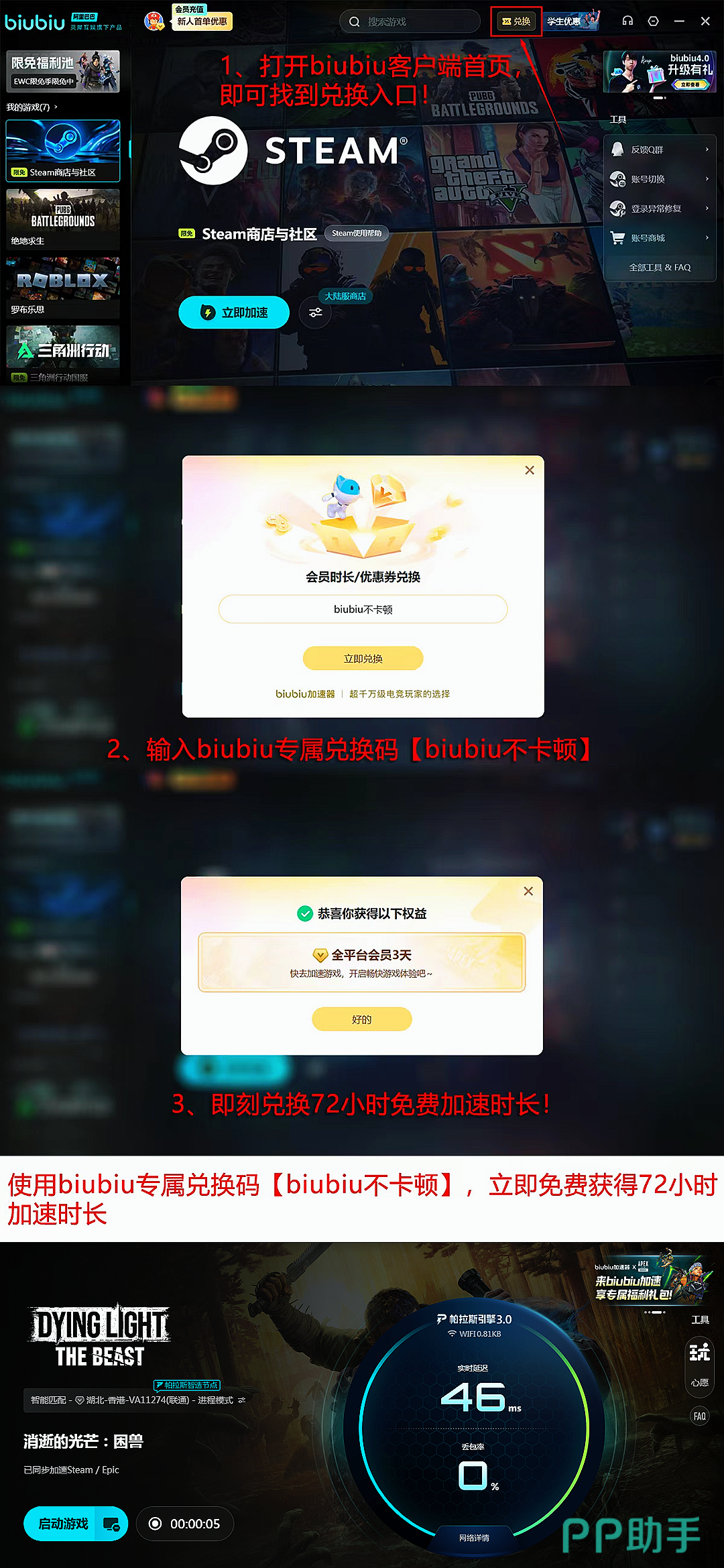 对于尚未掌握核心机制的新手用户,官方未提供详尽的新手引导闭环,建议优先前往biubiu内置游戏社区查阅实战向内容:如“夜间巡逻路线避险点位图”“感染值增长速率对照表”“垂直跳跃连招衔接帧数说明”等由资深玩家验证的结构化信息。该社区持续更新适配1.1.2版本的兼容性补丁说明与MOD加载规范,有效缩短学习曲线。值得一提的是,biubiu加速器对Steam平台全游戏库长期保持免费加速权限;新用户注册即赠24小时全功能试用期,输入兑换码【biubiu不卡顿】还可额外激活3日高级权限,累计达96小时,该福利同步向老用户开放。