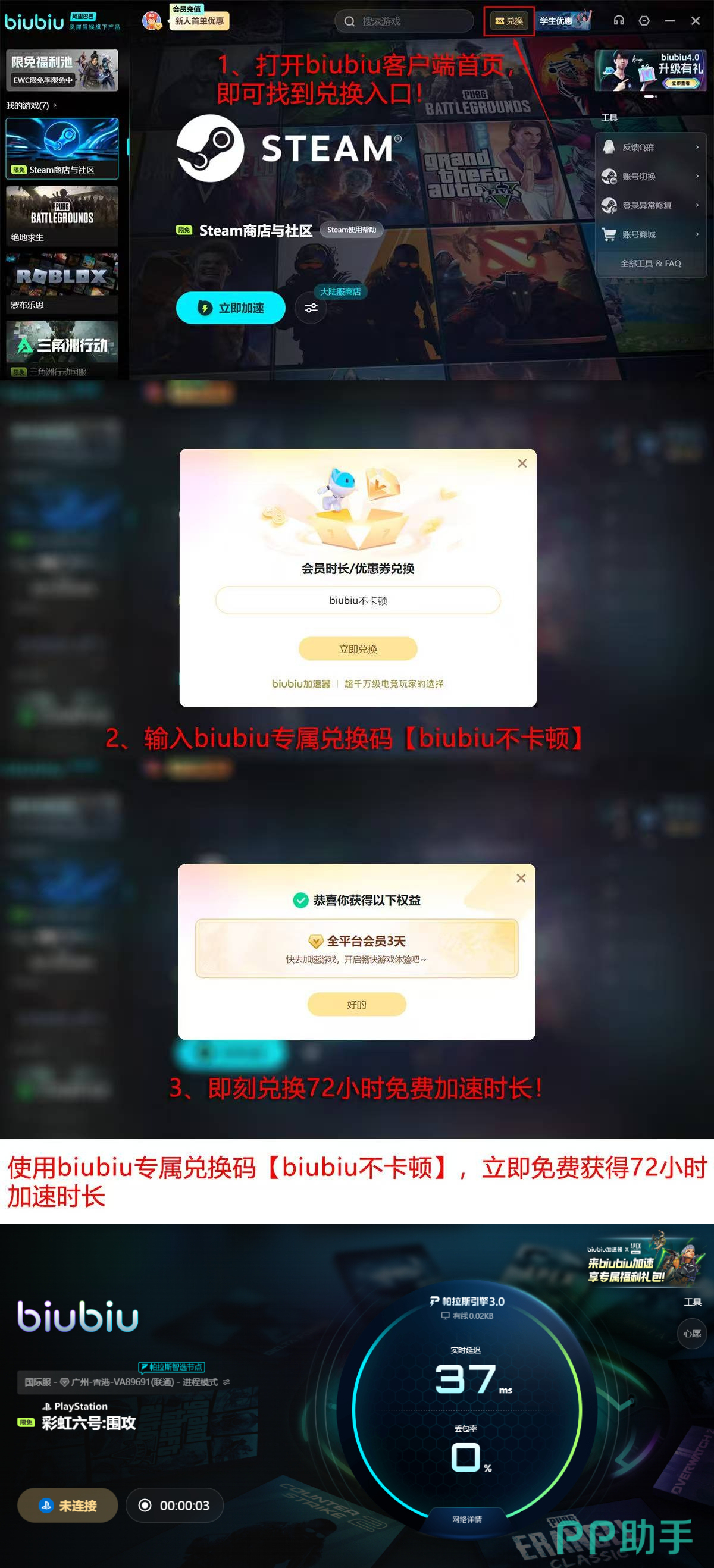 升级后的biubiu在加速效率和稳定性上都有了质的飞跃,为了尽可能降低玩家尝鲜门槛,目前新用户注册即送专属回馈24小时全平台免费加速服务,并且输入专享口令【biubiu不卡顿】,即可再享稳定体验72小时福利,两者叠加共可享受96小时无忧加速体验。