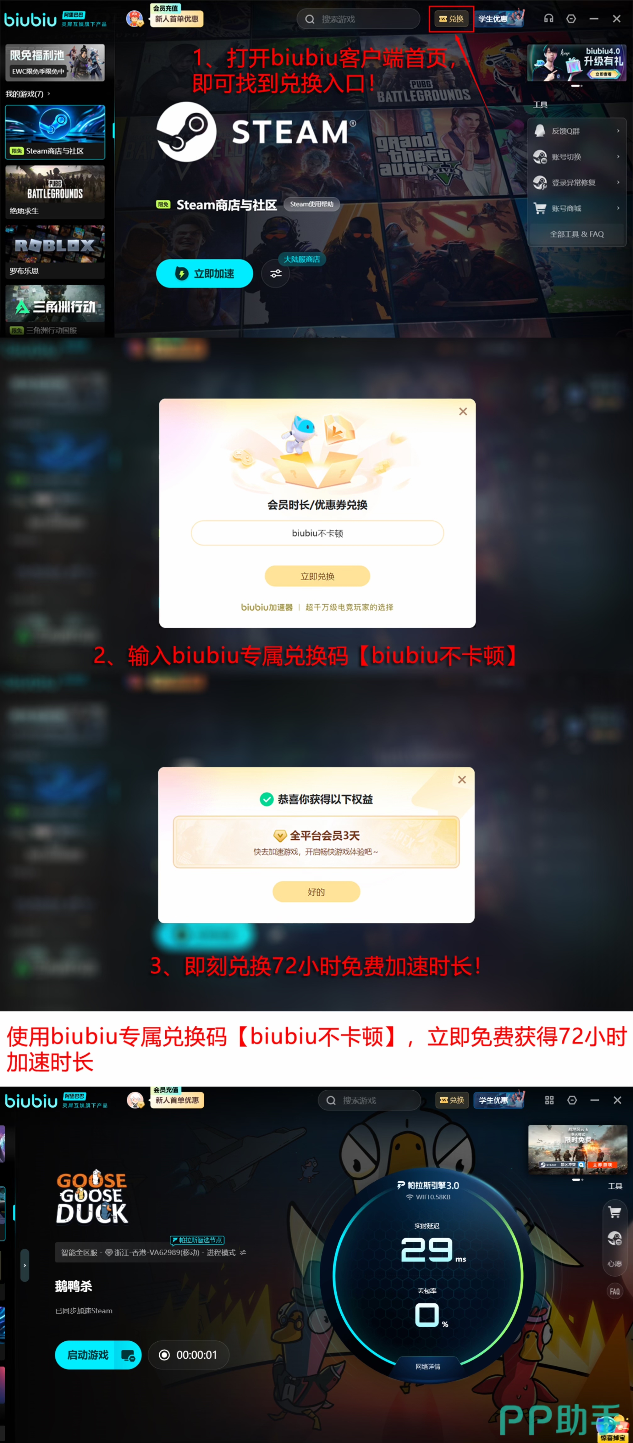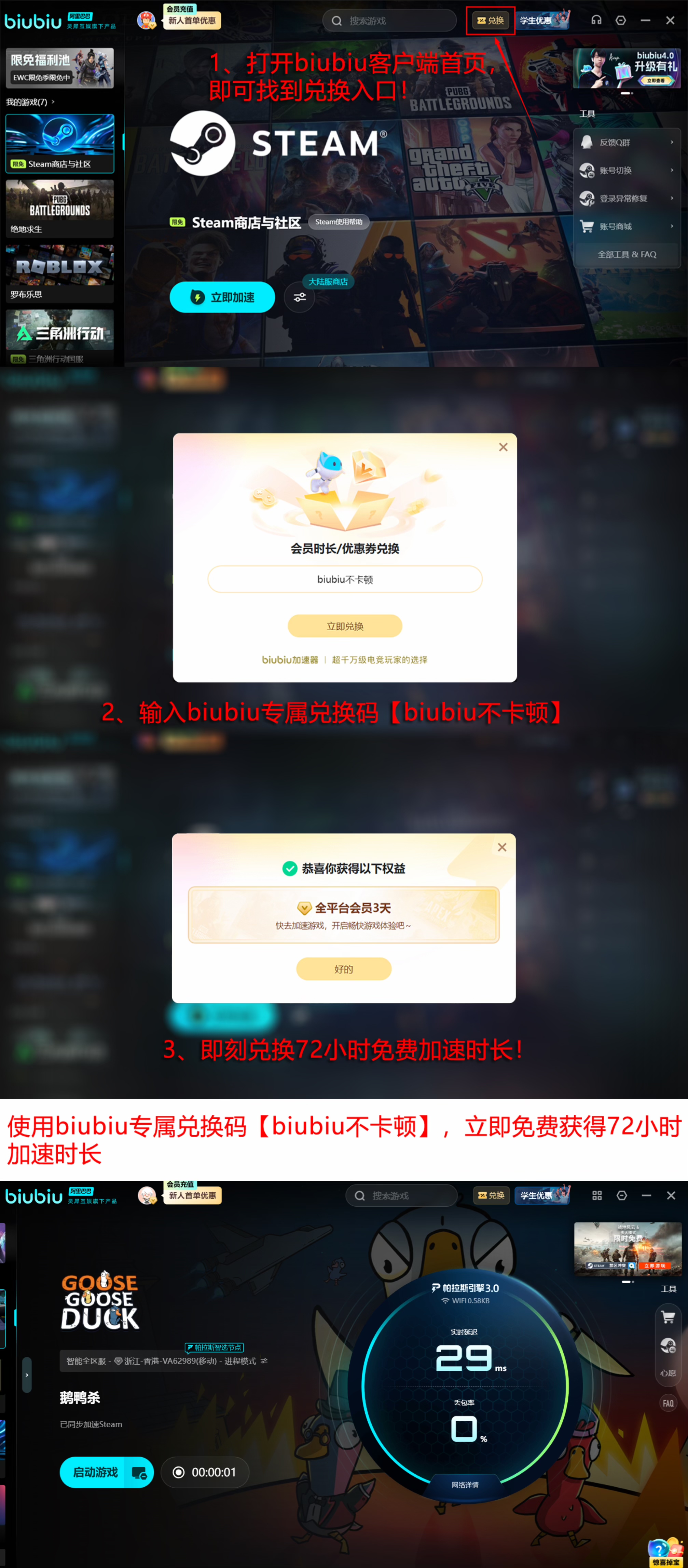 为降低新手使用门槛,biubiu特别设置新用户注册即赠24小时全功能加速时长,零成本验证实际效果;同时上线【biubiu不卡顿】限时活动,所有用户均可领取一次,获赠3天加速权益。两项叠加,新用户最高可享96小时连续加速体验,充分满足多日高频游戏需求。