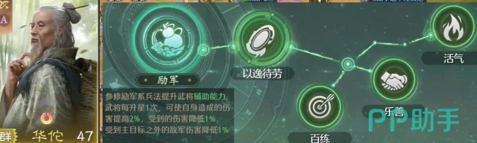 华佗担任专职治疗与防御强化角色,其战略价值远超基础回血功能。技能搭配首选“天香”与“陷阵营”:“天香”提供群体持续治疗,“陷阵营”则直接提升全队物理与策略双抗。若“陷阵营”尚未解锁,可用“仁治武功”或“刮骨”过渡;其中“仁治武功”侧重团队减伤,“刮骨”偏重单体净化与回复,均能保障队伍生存下限。在对抗高血量精英目标时,华佗的治疗量直接决定整场战斗能否完成资源消耗胜利。