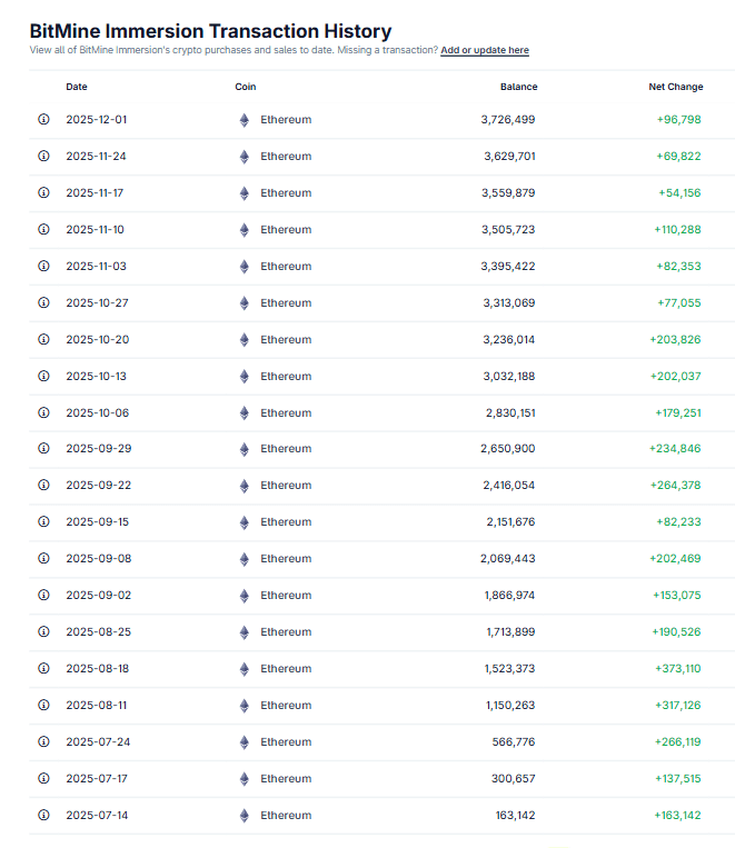 仅在第四季度,BMNR就取得了……九笔以太坊交易这使得国库余额达到 370 万枚以太坊。放大来看,这相当于过去三个月增加了约 90 万枚以太坊,国库余额增长了 33%。