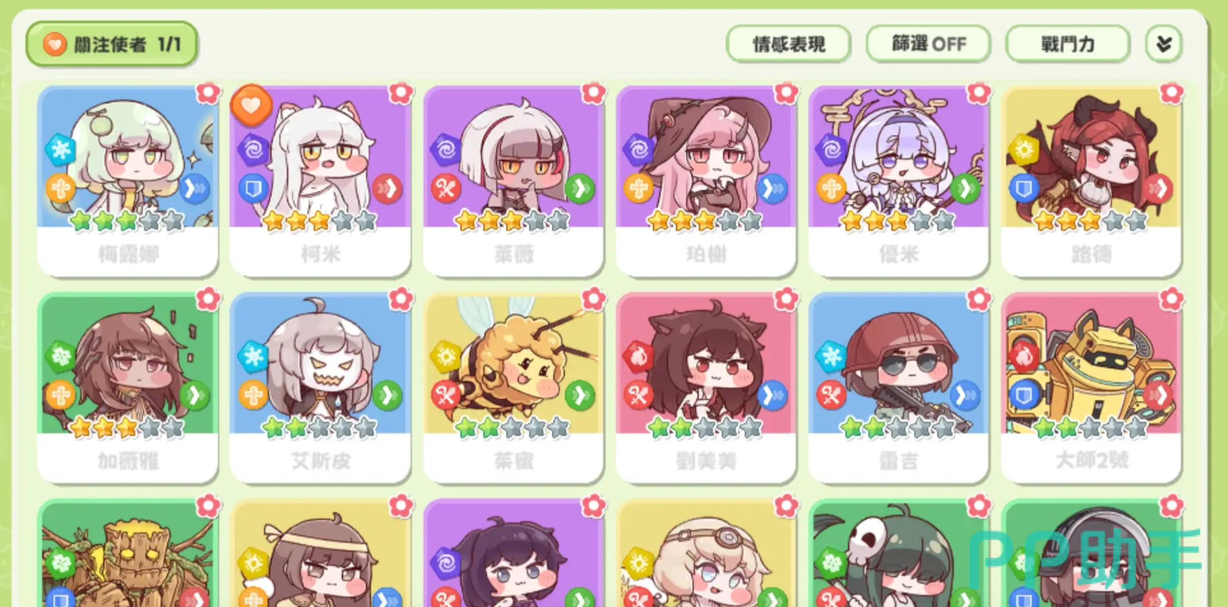 此外,游戏里的“属性颜色加成”也可以是一种配队思路。同一个阵容中如果能有4个相同颜色属性+2个相关颜色属性,还能额外获得属性加成,比如伤害变高,回血更快等效果。很多新手玩家不知道这一点,看到是符合定位的角色就塞进队伍,完全不考虑属性。要凑到两种属性可能比较难,所以大家尽量凑到4个相同的属性先。
