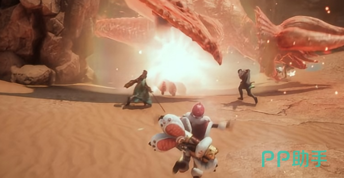 角色机制设计强调空战协同性:当佩佩完成跳跃动作后衔接重弩炮射击,可触发专属腾空状态技能,使角色短暂滞空并维持攻击姿态。该机制不仅提升生存容错率,更赋予其垂直维度的战术选择权——自上而下的俯冲打击可有效规避地面威胁,同时强化对大型怪物弱点部位的命中效率。