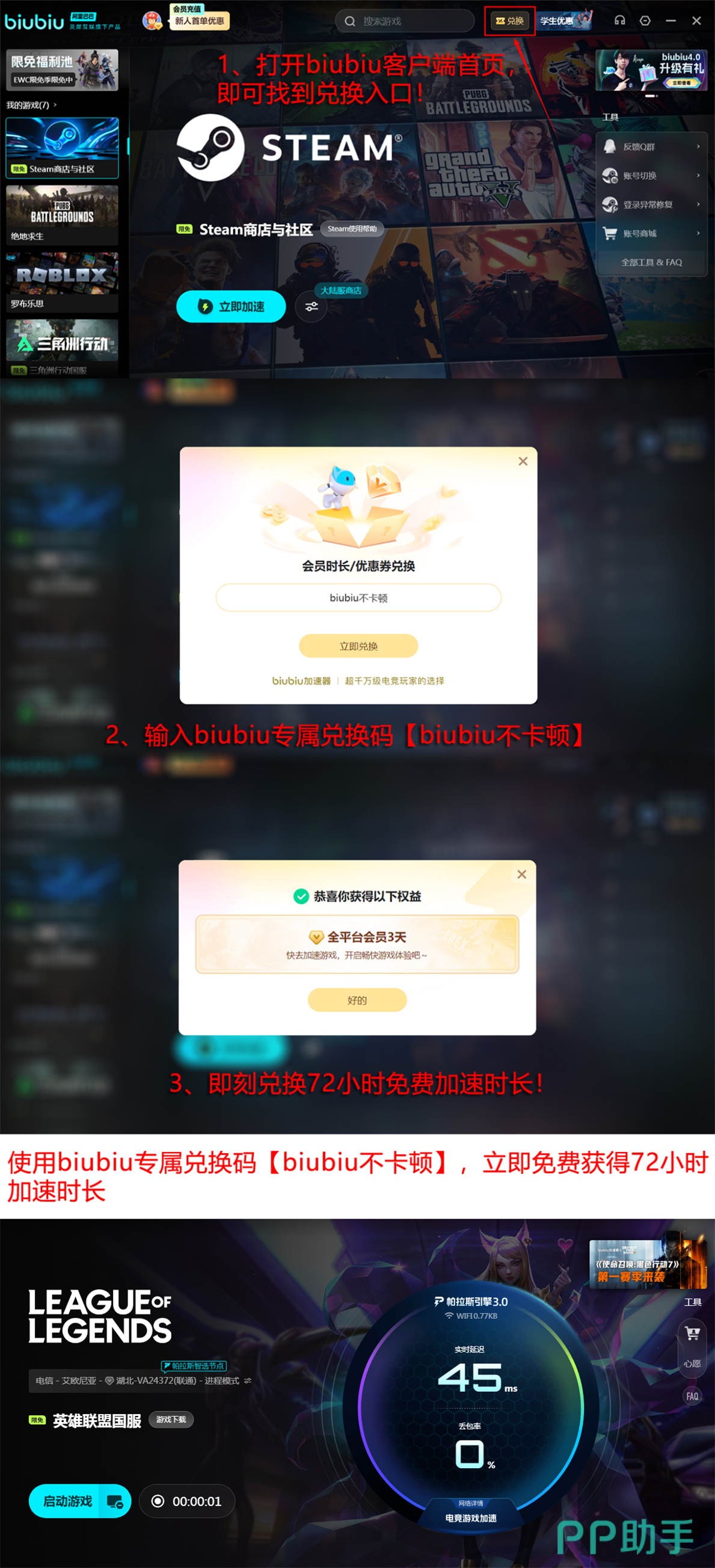 新用户注册即可获赠24小时全功能免费加速时长;另附通用兑换码【biubiu不卡顿】,每个账号限兑一次,可额外获得72小时加速权限。两项叠加总计96小时,足以覆盖完整新手适应周期与多场高强度排位检验。