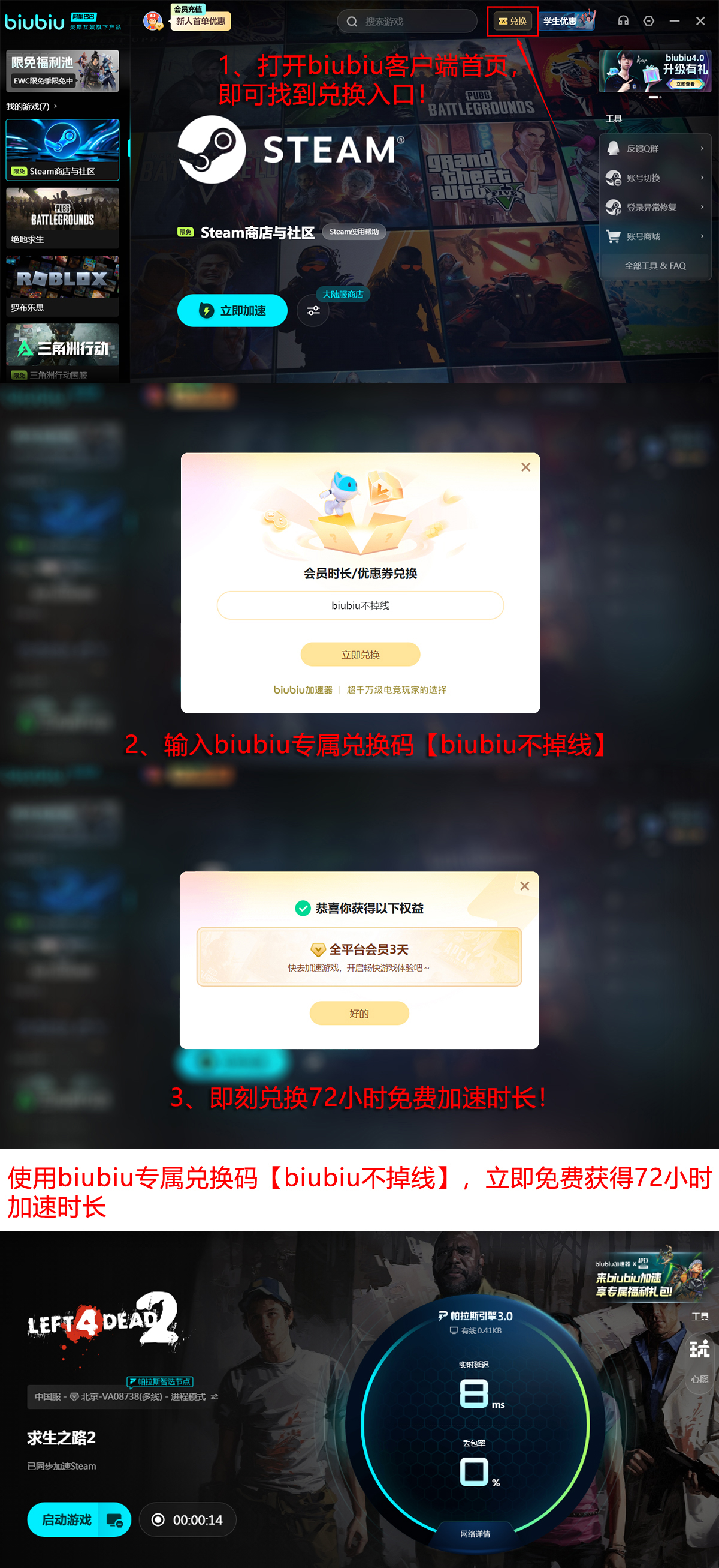 新用户注册即赠24小时全游戏加速权益;输入专属福利口令【biubiu不掉线】,可额外激活72小时加速权限,两项叠加享满96小时高品质网络服务,助力新手快速融入团队作战节奏。