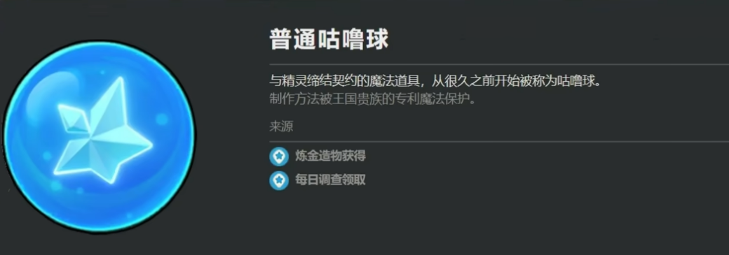普通咕噜球为蓝色半透明球体,中央嵌有一颗五角星图案,属于基础型捕捉工具。该道具可通过炼金台免费合成,所需材料为常规矿石并消耗一定体力值。此外,每日登录后还可根据魔法师等级领取固定数量的普通咕噜球——等级越高,可领取上限越高。该球适用于初级精灵捕捉,通常只需削弱目标生命值至约三分之一以下,投掷1–2枚即可完成收服。