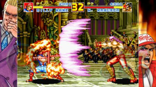 SNK于1993年推出的格斗奠基作,构建了“饿狼传说”世界观雏形。首次登场角色包括泰瑞·博加德、安迪·博加德、比利·凯恩等,其基础招式、投技判定、怒气系统均为后续《拳皇》系列提供直接技术蓝本。游戏采用四键布局(轻重拳+轻重脚),支持空中连段、墙壁反弹、地面起身反击等进阶操作,角色平衡性经过数百场街机厅实战校验,被业内公认为格斗游戏工业化设计的分水岭。