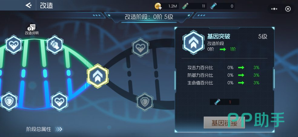 基因改造就是突破自身属性数值,需要消耗改造药剂,能够提升精英的等级,在攻击力,生命值和防御力这一方面都会得到强化,当各阶段满级之后,可以用改造血清基因突破,战力会再次提升一大截,无论之后是打副本还是进行VIP都可以有效占据上风。