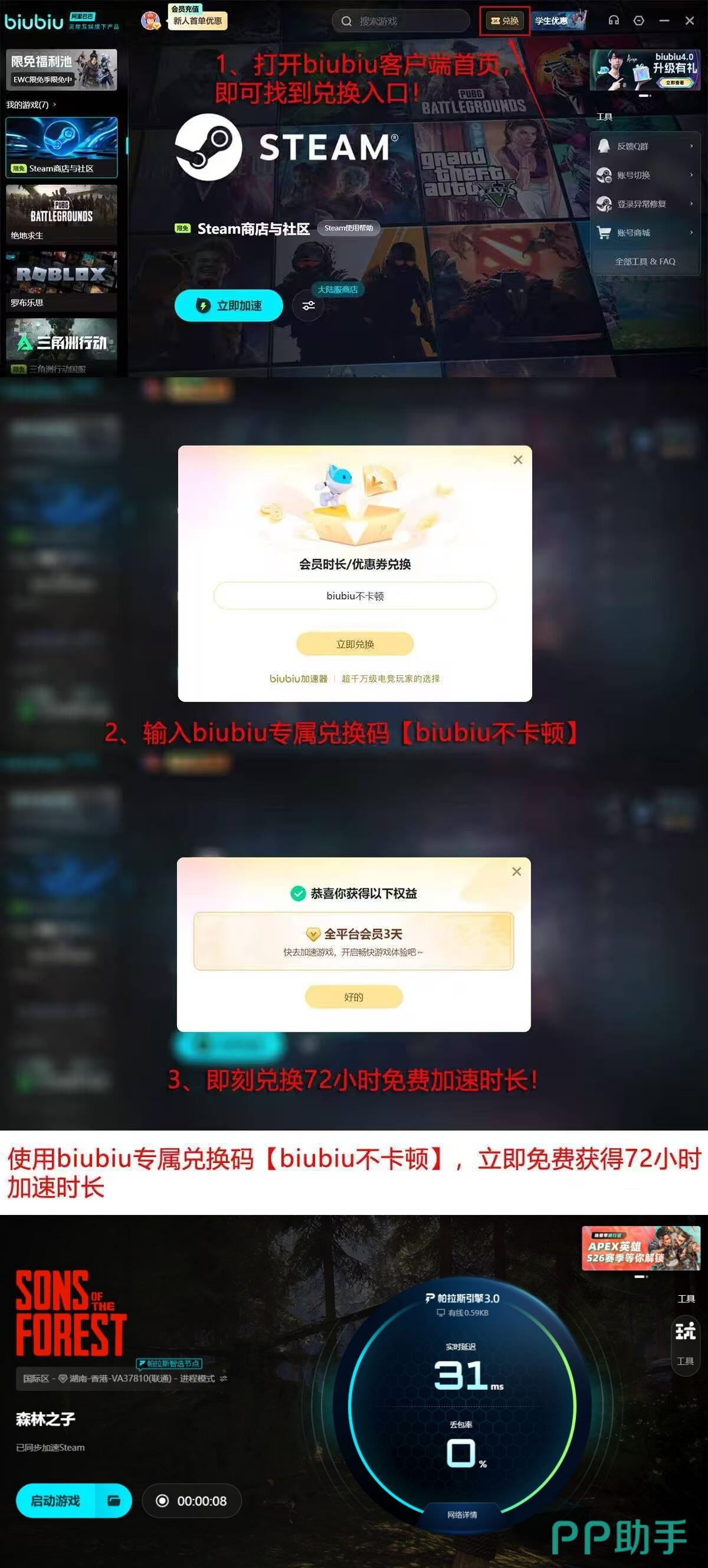 操作流程极简:启动加速器后,输入“森林之子”并选择对应服务器分区(如全球服/亚洲服),一键启用加速。单次仅支持一款游戏加速,退出游戏时建议手动关闭加速进程;亦可将游戏添加至“我的游戏库”,后续点击即可直连加速并启动,省去重复配置步骤。新用户注册即赠24小时全功能免费加速时长;所有用户凭口令【biubiu不卡顿】可额外兑换3天连续加速权益。
