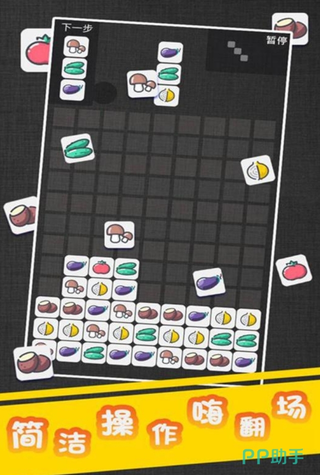 经典三消机制的扎实呈现:果蔬图标自上而下随机生成并下落,玩家需在有限空间内完成横向或纵向三连及以上匹配。关卡随难度提升逐步解锁新图标类型与方块形态,堆叠高度触顶即判负。操作响应迅速,反馈清晰,无广告弹窗,全程本地运算。