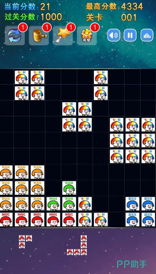 融合表情包文化与类俄罗斯方块布局逻辑——玩家拖动预设形状的表情图块填入网格,达成整行或整列覆盖即可触发消除。每轮消除累计分数,达标即通关。内置道具系统(如旋转、清除单格、重排等)获取门槛低,使用无冷却,有效缓解卡关压力,适配各类操作习惯。