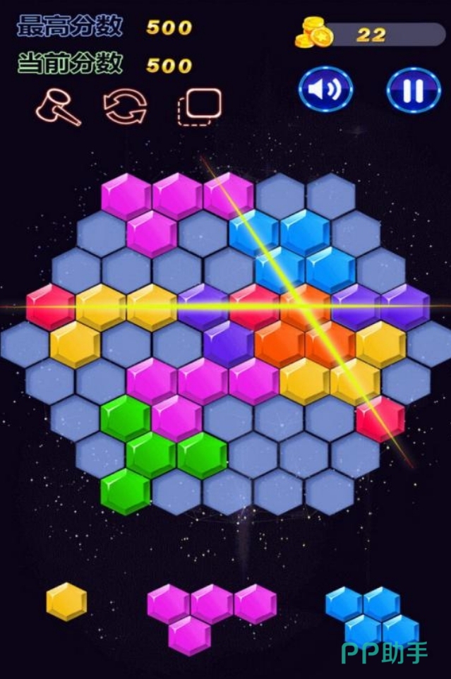 采用蜂窝状六边形棋盘结构,宝石图块按固定方向嵌入格点。消除条件为任意一条直线(含斜向)被同类型宝石完全填满,即时清除并计分。当新增图块无法合法置入时游戏终止。全本地计算,无云同步,启动快、耗电低,是地铁信号盲区或飞行模式下的理想选择。