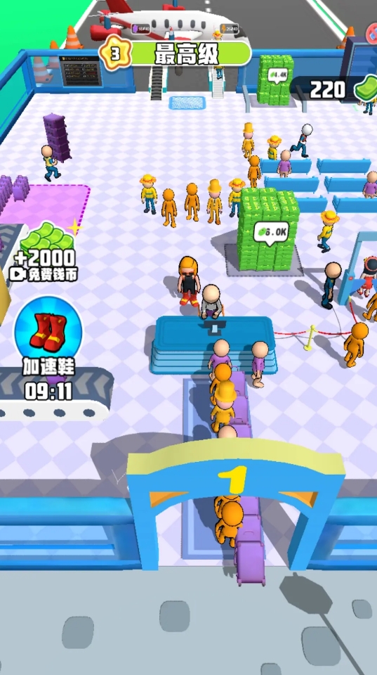 游戏聚焦于机场地面服务全流程管理,玩家以一线管理者身份统筹旅客动线:从值机柜台开放数量、安检通道排布,到行李托运效率与中转衔接时效,均需精细化调控。随着日均客流增长,须动态增聘安检员、问询专员及保洁人员,并合理布局自助值机终端与电子显示屏。所有岗位人力配置与设施投入均依赖服务收益反哺,形成可持续的轻度经营循环。