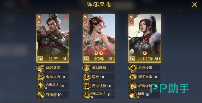 另外一人大家可以去搭配吕玲绮,吕玲绮是个不错的辅c,她的自带技会在发动后对目标打出武力伤,并且还有一定概率给敌人施加上威压状态3秒时间,有利于我方接下来的攻击,最后三人的技能携带大家可以参考下图。