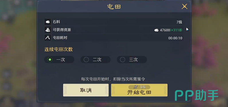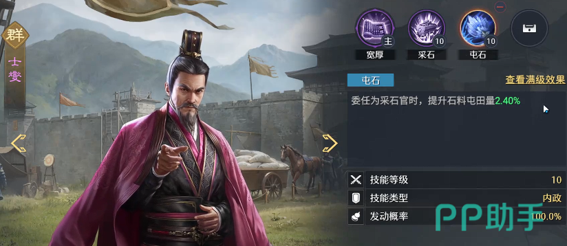 进一步放大收益的方式是结合武将战法系统。当内政官参与战法升级并达到10级时,可获得+10点政治属性加成,使采石官屯田量跃升至约4400单位。以单次囤积5轮计算,累计增益可达2万以上石料——这意味着领先优势随屯田次数持续扩大,而非一次性收益。