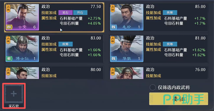 提升采石效率的关键在于内政系统中的「采石官」配置。默认单次屯田产量为1928单位,若将采石官的政治属性技能全部点满,单次产出可额外增加超1000单位。实操中建议采用“动态配置法”:在每次开启屯田前临时加点至满级,待资源到账后立即撤回技能资源,实现资源投入零损耗。该操作可稳定延长屯田周期约4–5天,显著缓解前期石料压力。