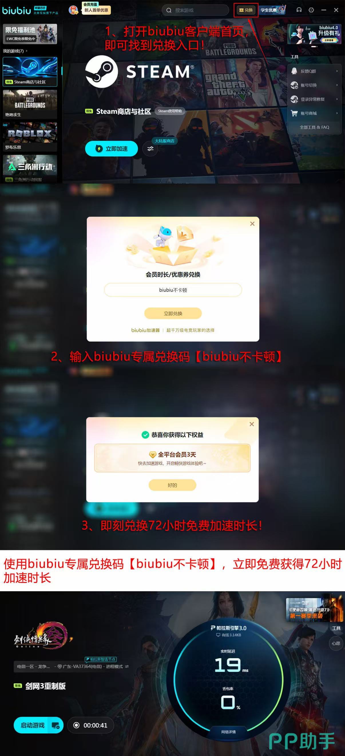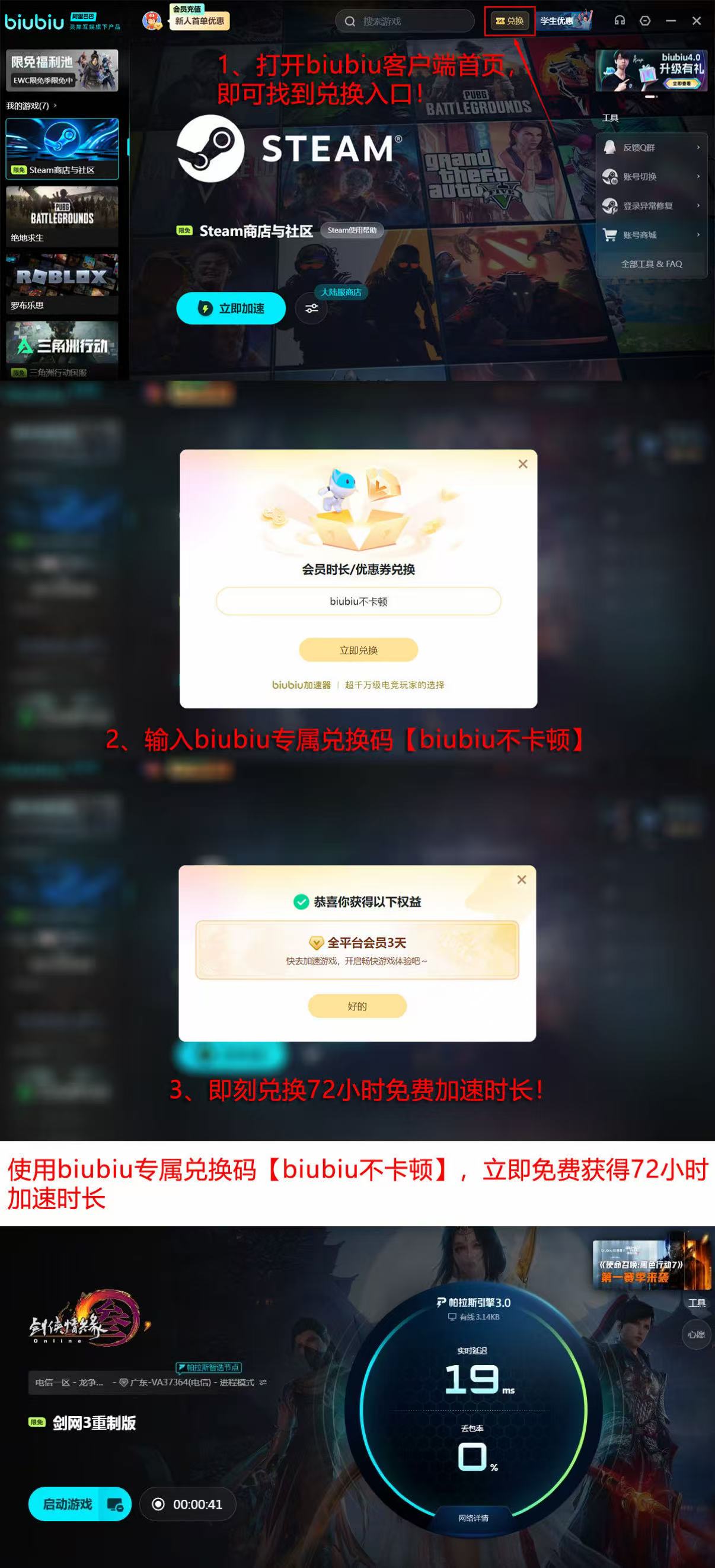 目前biubiu面向全体用户提供无门槛试用权益:新注册用户可直接获得24小时全功能免费加速时长,无需绑定支付方式或完成复杂任务。此外,输入专属兑换码【biubiu不卡顿】,即可额外领取连续72小时加速权限,该福利开放给所有账户类型,包括已激活的老用户账号。