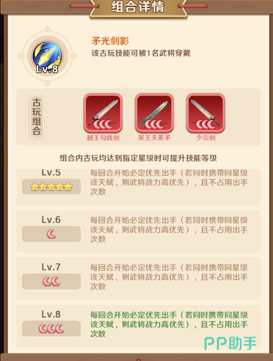 首推组合为【越王勾践剑】【吴王夫差矛】【少虡剑】三件套。该组合生效后,佩戴者在每回合开始时必定获得先手权,且不消耗常规行动次数。若敌我双方均有同星级该套装,则依据佩戴武将总战力判定先后顺序。这一机制看似简单,实则重构战斗节奏:辅助类武将可提前施放怒气增幅技能,使主力输出更快释放大招;控制型角色亦能抢占先机,对敌方关键单位施加沉默、眩晕或减益状态,在势均力敌的对抗中形成压制性开局。因此,该组合优先推荐装配于具备功能性先手能力的武将,如群体增益、驱散或硬控型角色。
